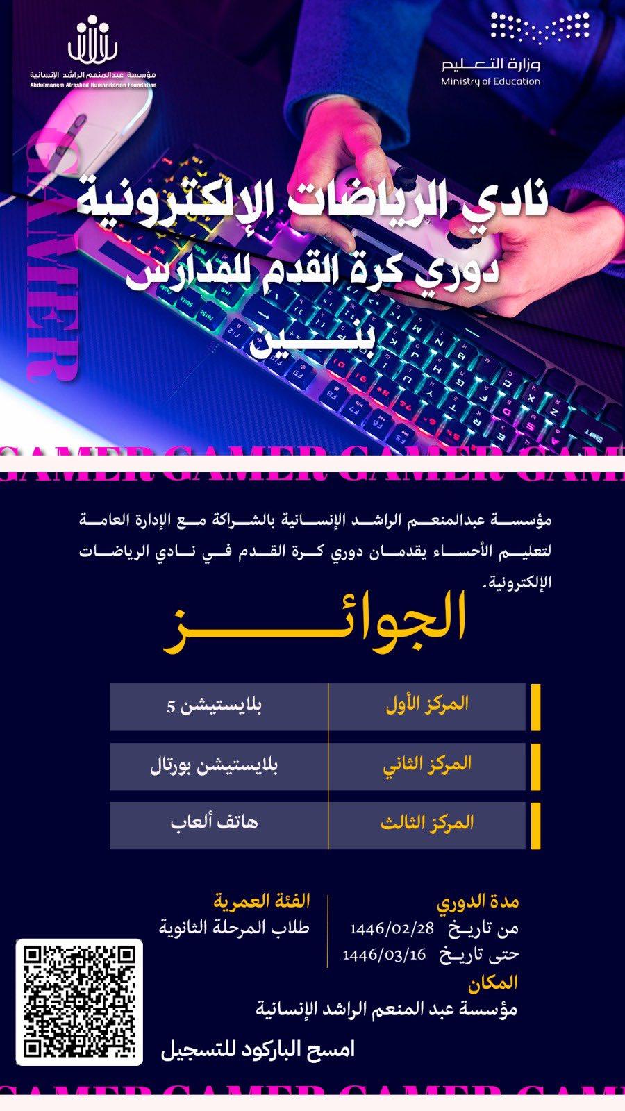 31 Aug مؤسسة عبدالمنعم الراشد الإنسانية بالشراكة مع تعليم الأحساء تطلق دوري كرة القدم في نادي الرياضات الإلكترونية بمقر المؤسسة، مع جوائز قيمة للمراكز الأولى. المزيد